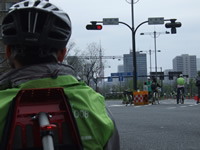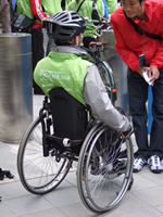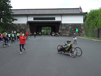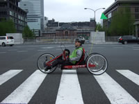 うぇるさん、ハンドサイクルで大手門前を信号待ち。
