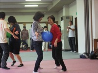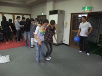 最初の種目は、ふうせんはさみリレー。てを使わずに、お腹とお腹でふうせんを挟んで運びます!