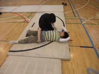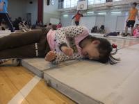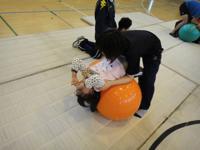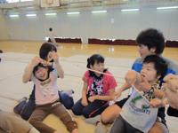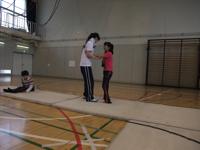 長いロープを両手で持って、みんなで回します。手はバンザーイ!息をぴったり合わせてね。
